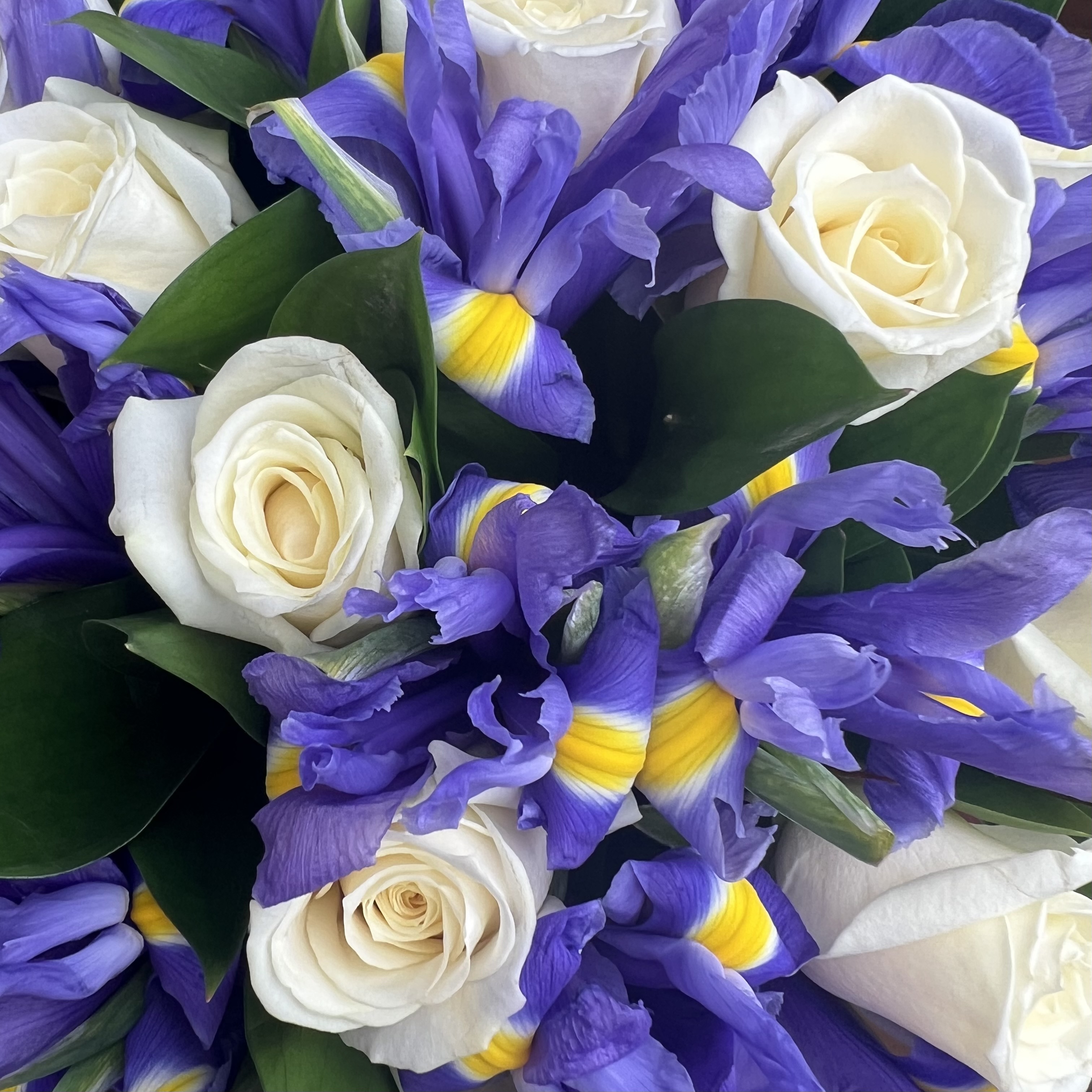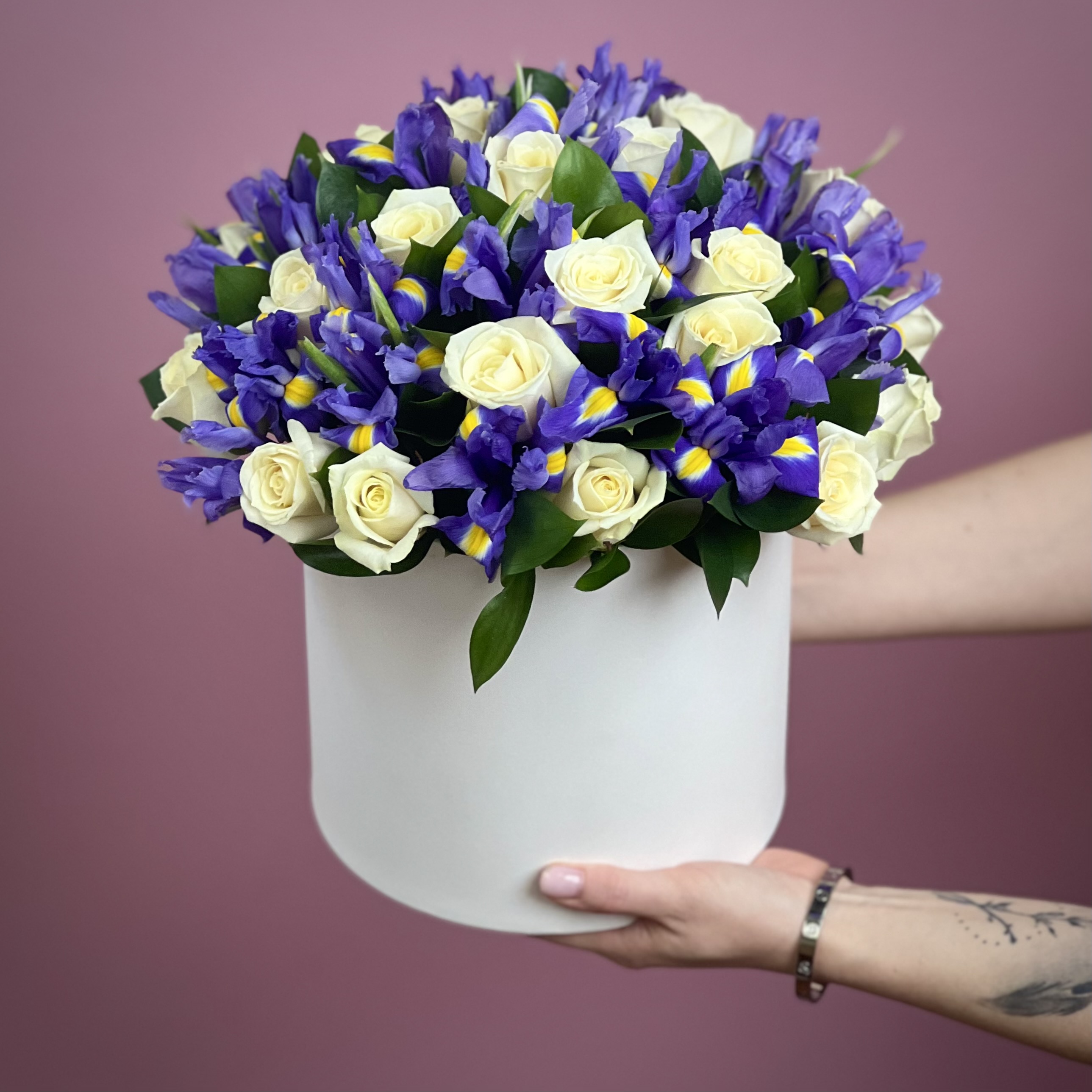 Букет Амарант – красивый нежный подарок из цветов в коробке. В составе букета 21 ирис, 21 роза с длиной стебля 50 см. На дне коробки заботливо уложен Оазис, это специальная губка, способная впитать огромное количество жидкости. Таким образом, цветы будут долго стоять и радовать своим ароматом, свежестью и красотой.